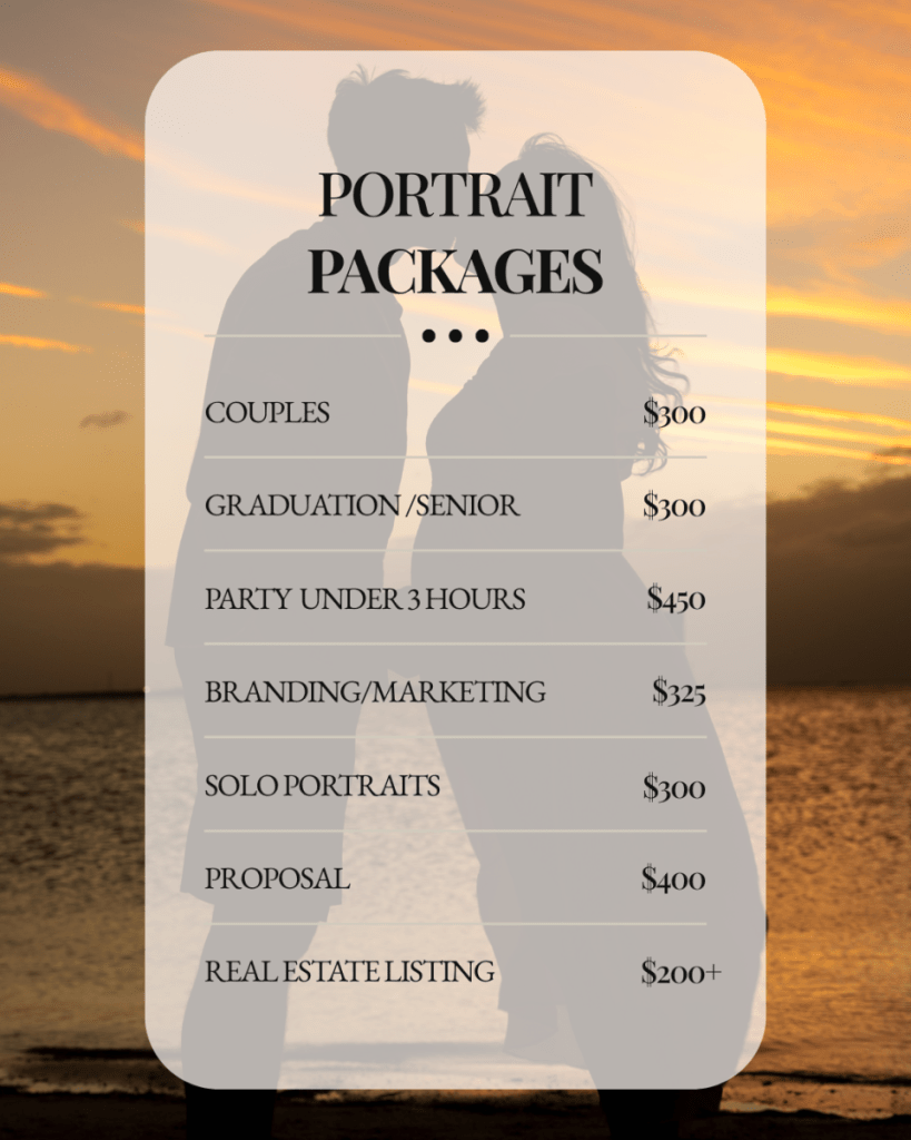 Pricing Travel Fees May ApplyDon’t see what you’re looking for? Fill out my contact sheet and let’s make it happen! Inquire